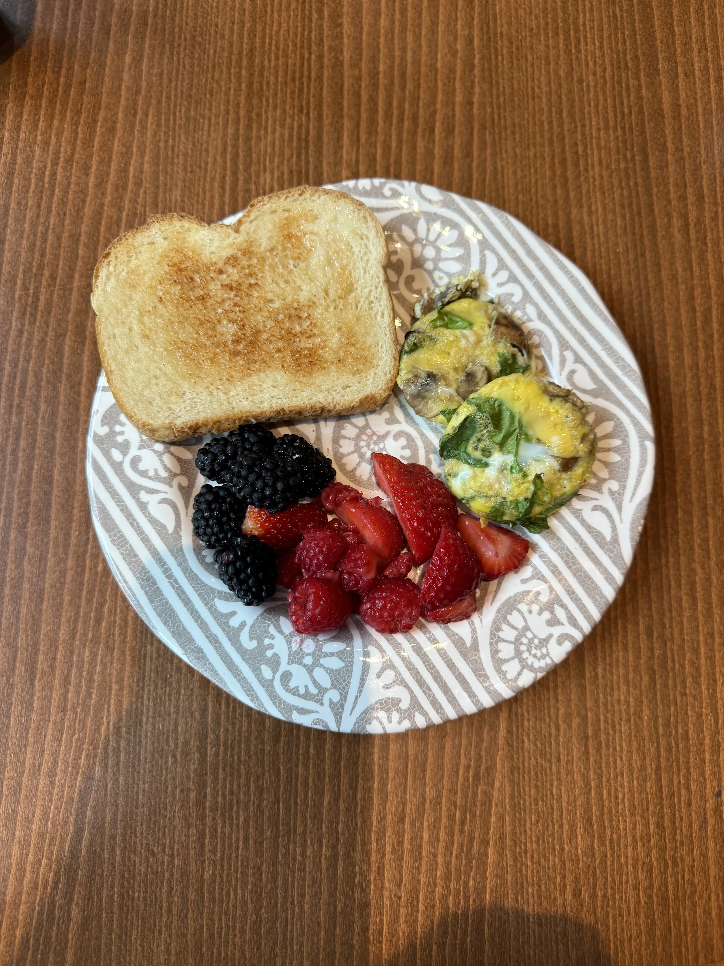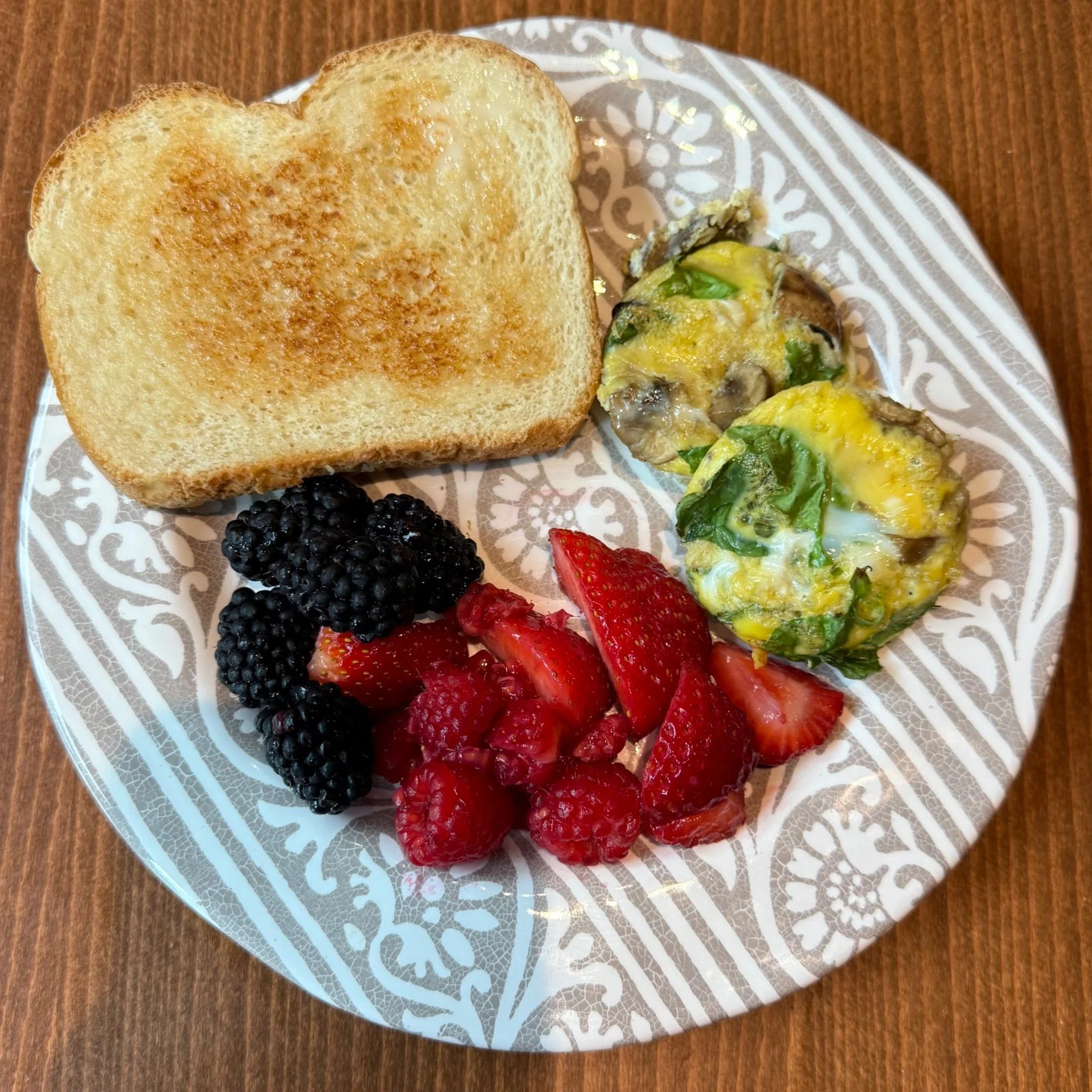 Start by cracking six eggs into a bowl, and whisking with salt and pepper. Chop about a half cup of spinach, wash and halve half a container of Baby Belle mushrooms (or your favorite kind), and add to the egg mixture. Add a dash of milk to the egg mixture if desired. In a muffin tin, use baking spray to spray each of the holder and fill a little over half full with the mixture. Place the tin in the oven (preheated to 375), and bake for 12-15 minutes. Enjoy with your favorite fruit and piece of toast!