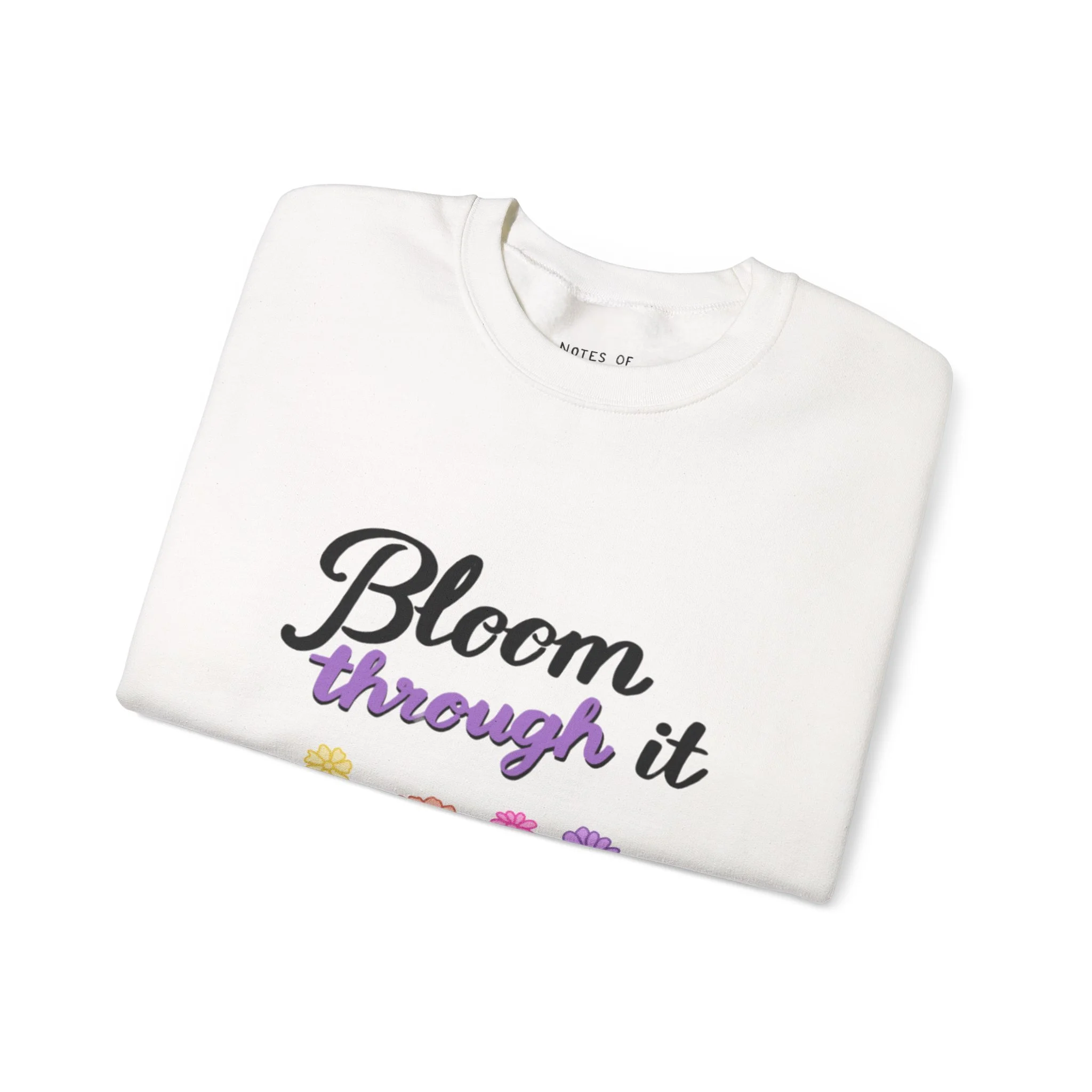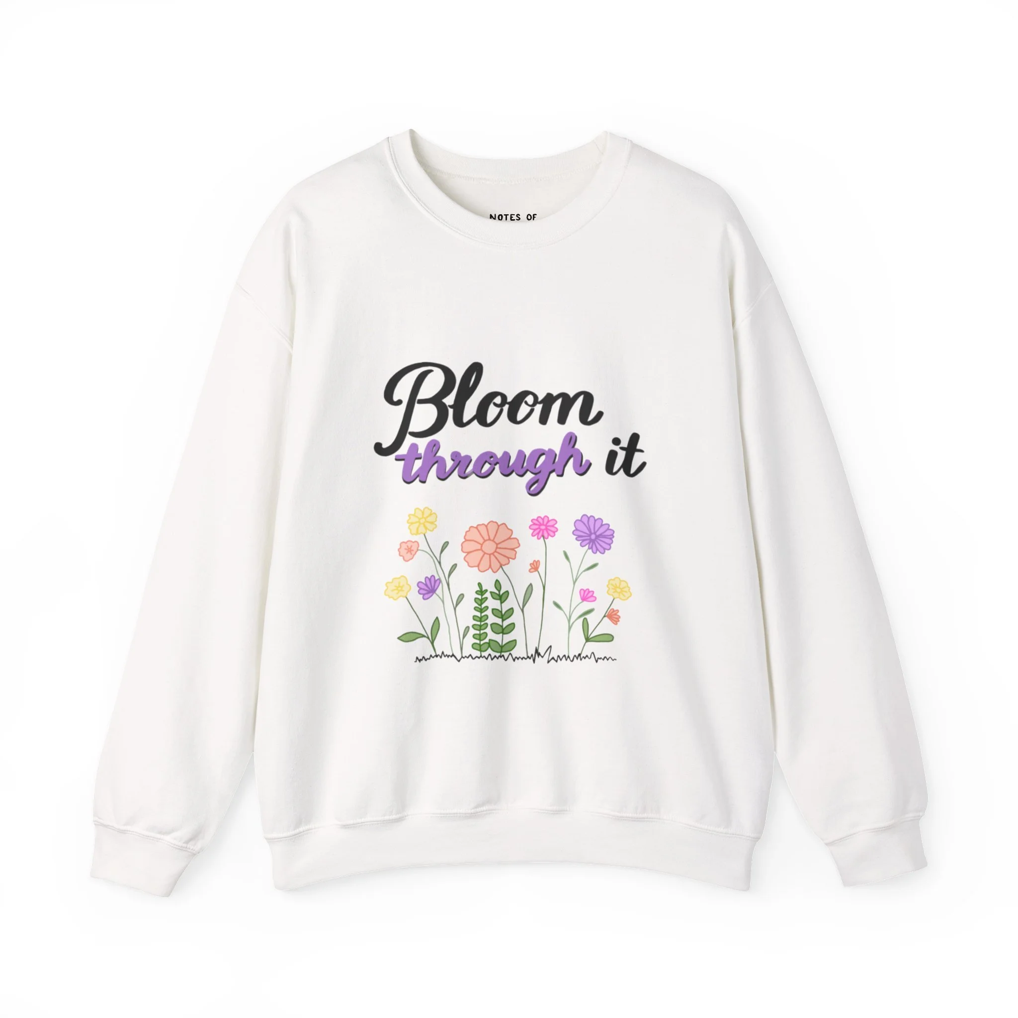 Light, soft, and quietly hopeful — this crewneck sweatshirt carries a gentle reminder to keep growing. A simple floral illustration blooms beneath hand-lettered script that reads “Bloom through it,” rendered in soft pastels that lift a quiet white or heather base. It feels like a calm morning: warm hands around a coffee, a walk through dew-tipped grass, a small push toward the day. Wear it when you need a steadying comfort or want to share a subtle message of resilience. The relaxed crew neckline and classic fit make it easy to layer over tees or pair with lounge bottoms. Thoughtful details — ribbed collar, cuffs, and waistband, tubular knit construction, and reinforced double-needle stitching — keep the silhouette clean and long-lasting. OEKO-TEX dyes and ethically sourced cotton give this piece a conscientious touch.
