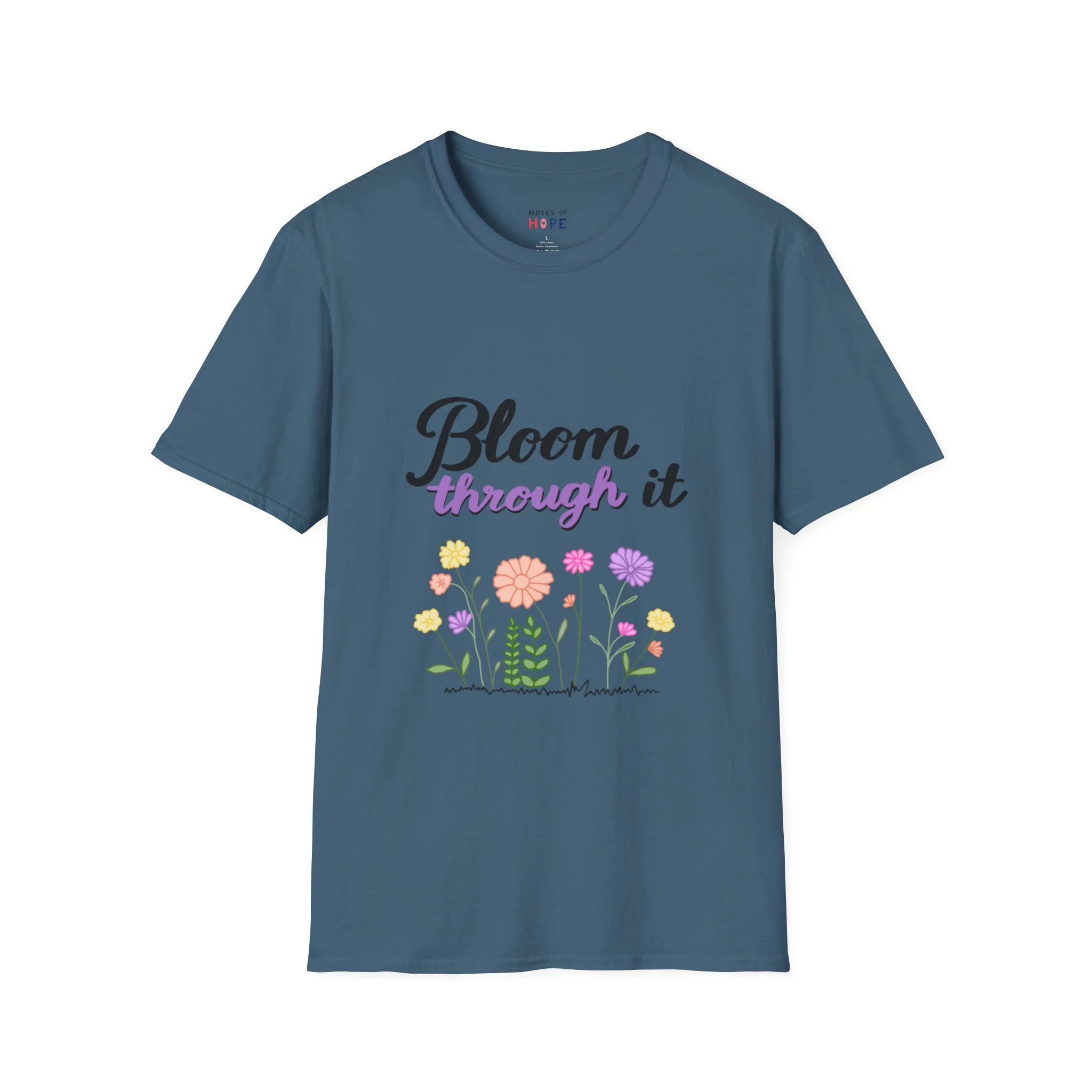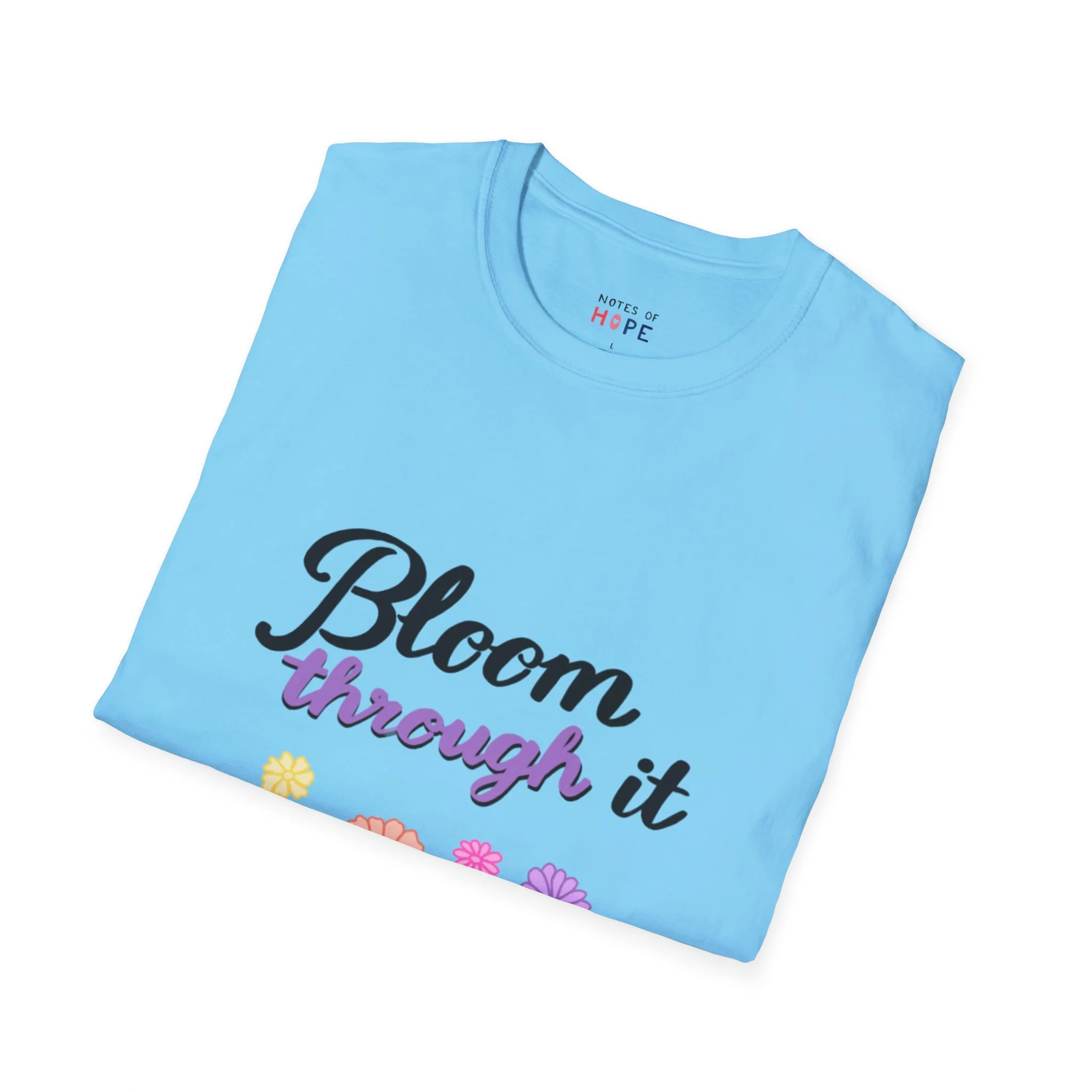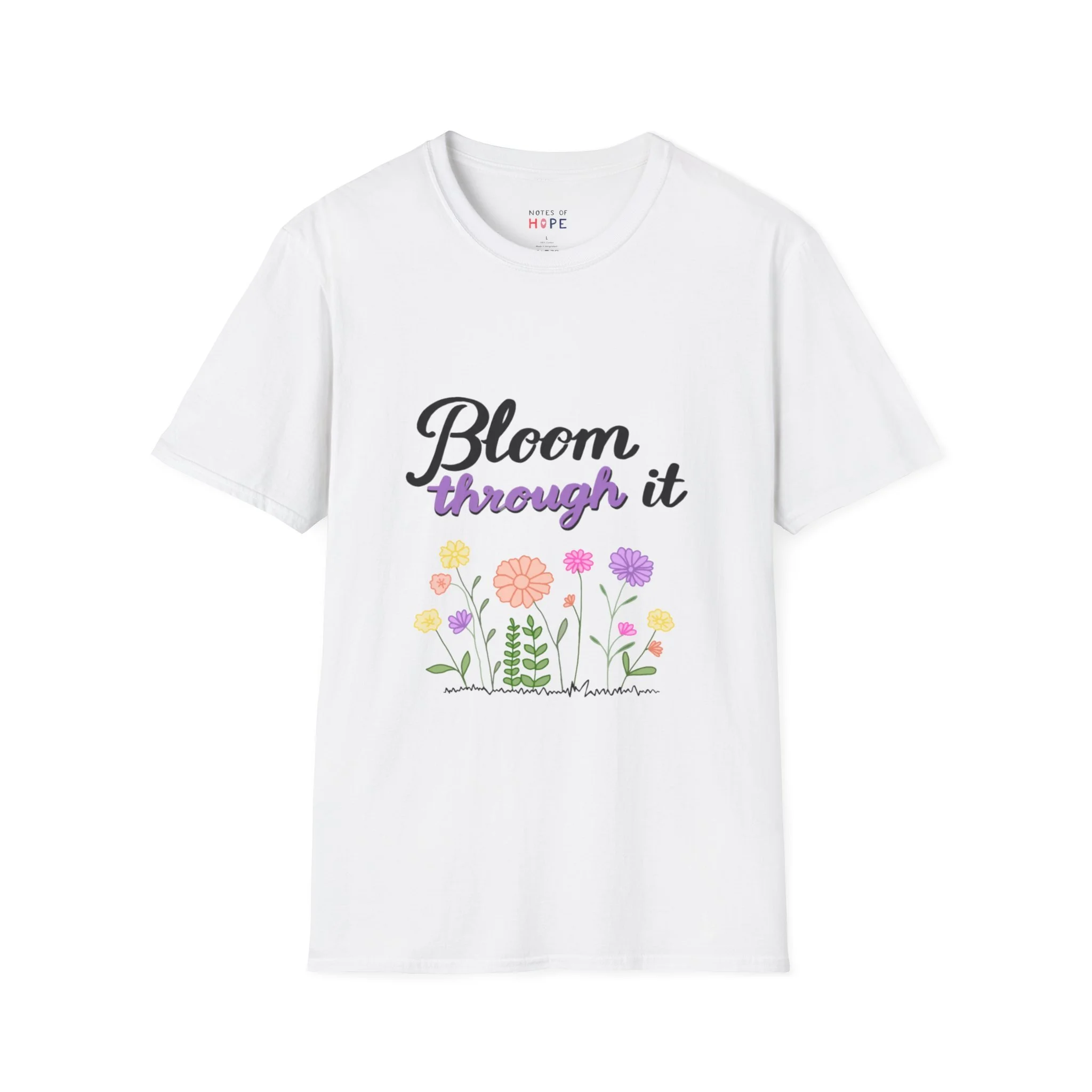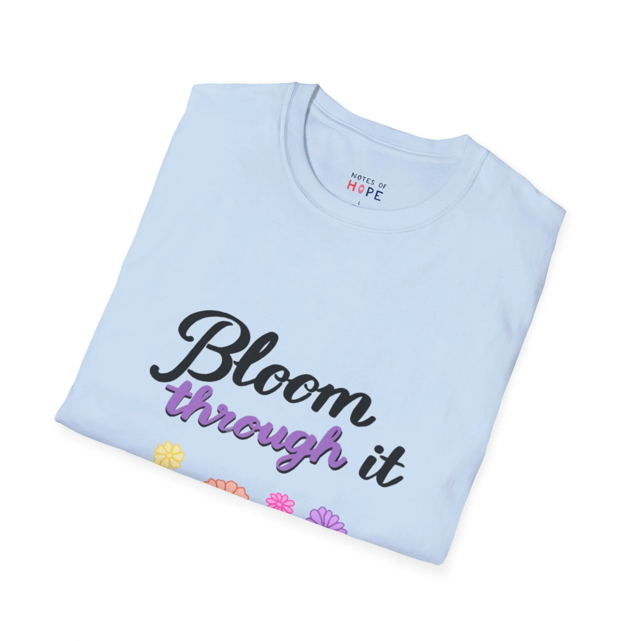 Soft, gentle, and quietly hopeful — this lightweight tee carries a small garden of hand-drawn flowers and the tender reminder: “Bloom through it.” The crew neck and classic fit sit comfortably at the shoulders while the smooth ring-spun cotton feels breathable against the skin. Wear it on slow mornings, neighborhood walks, or layered under a cardigan when you need something calm and reassuring. The delicate floral palette and cursive script read like a note from a friend — subtle, uplifting, and steady.