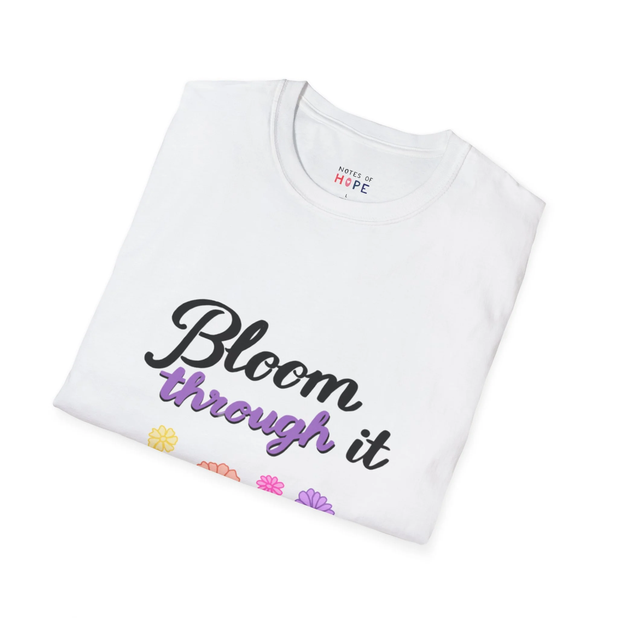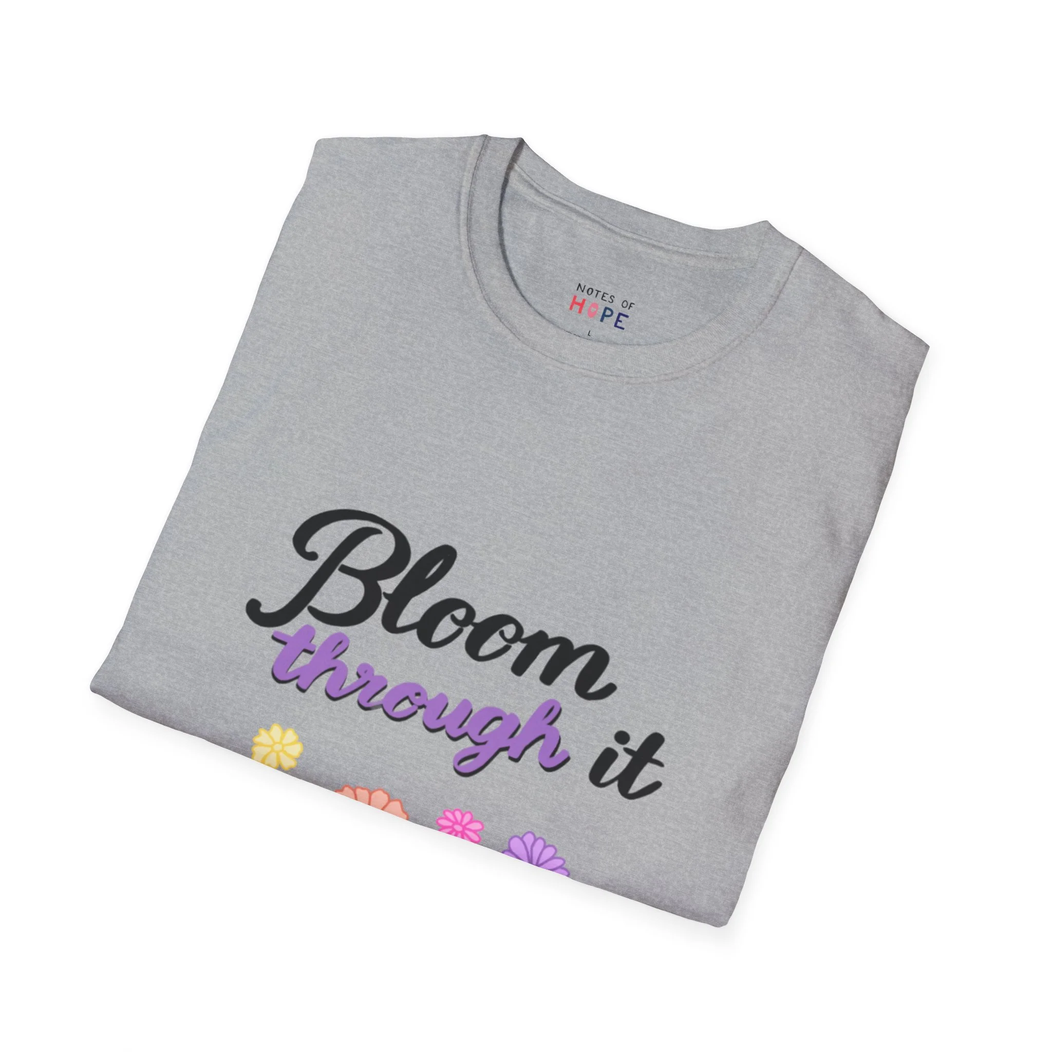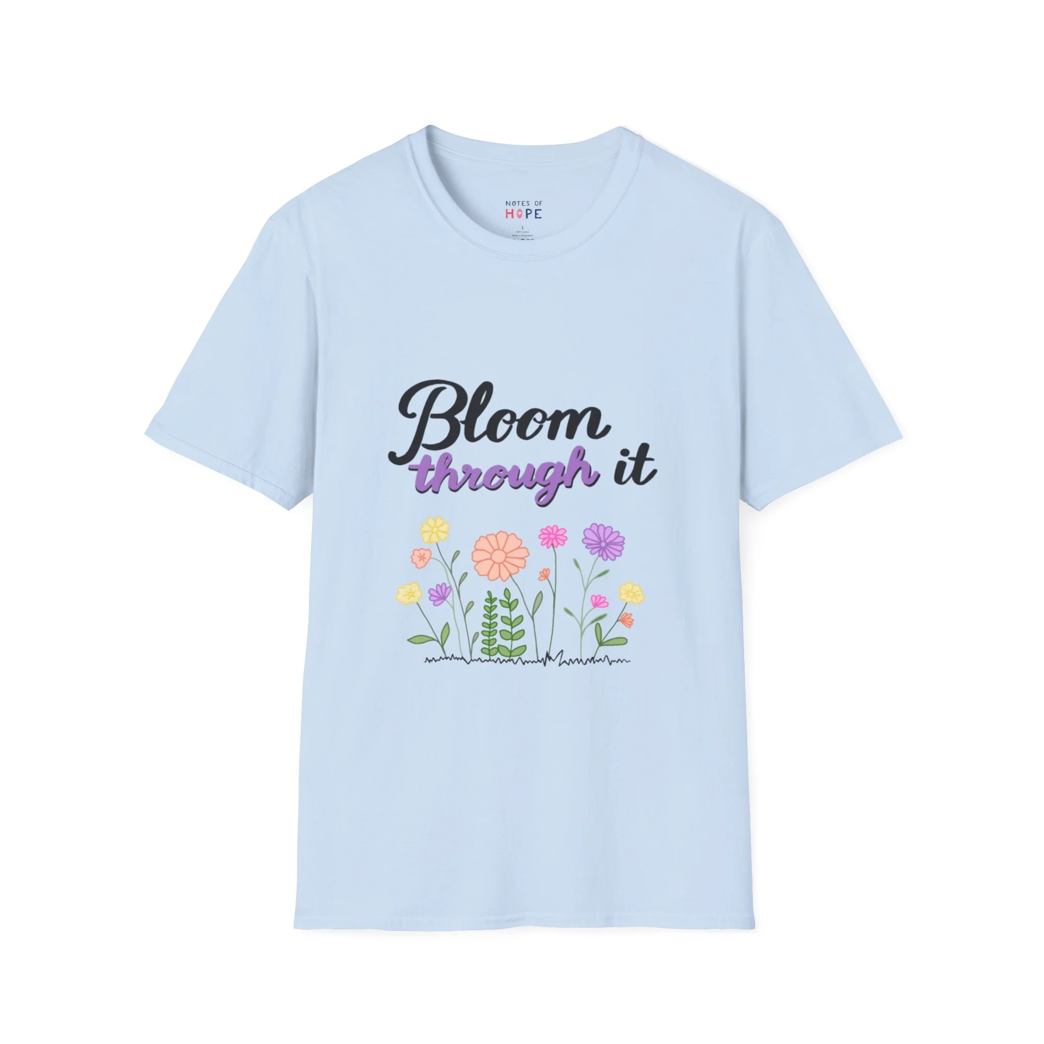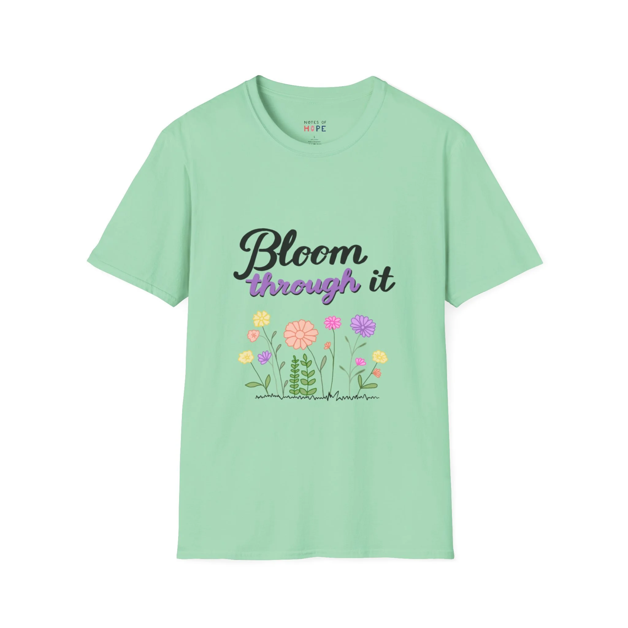 Soft, gentle, and quietly hopeful — this lightweight tee carries a small garden of hand-drawn flowers and the tender reminder: “Bloom through it.” The crew neck and classic fit sit comfortably at the shoulders while the smooth ring-spun cotton feels breathable against the skin. Wear it on slow mornings, neighborhood walks, or layered under a cardigan when you need something calm and reassuring. The delicate floral palette and cursive script read like a note from a friend — subtle, uplifting, and steady.