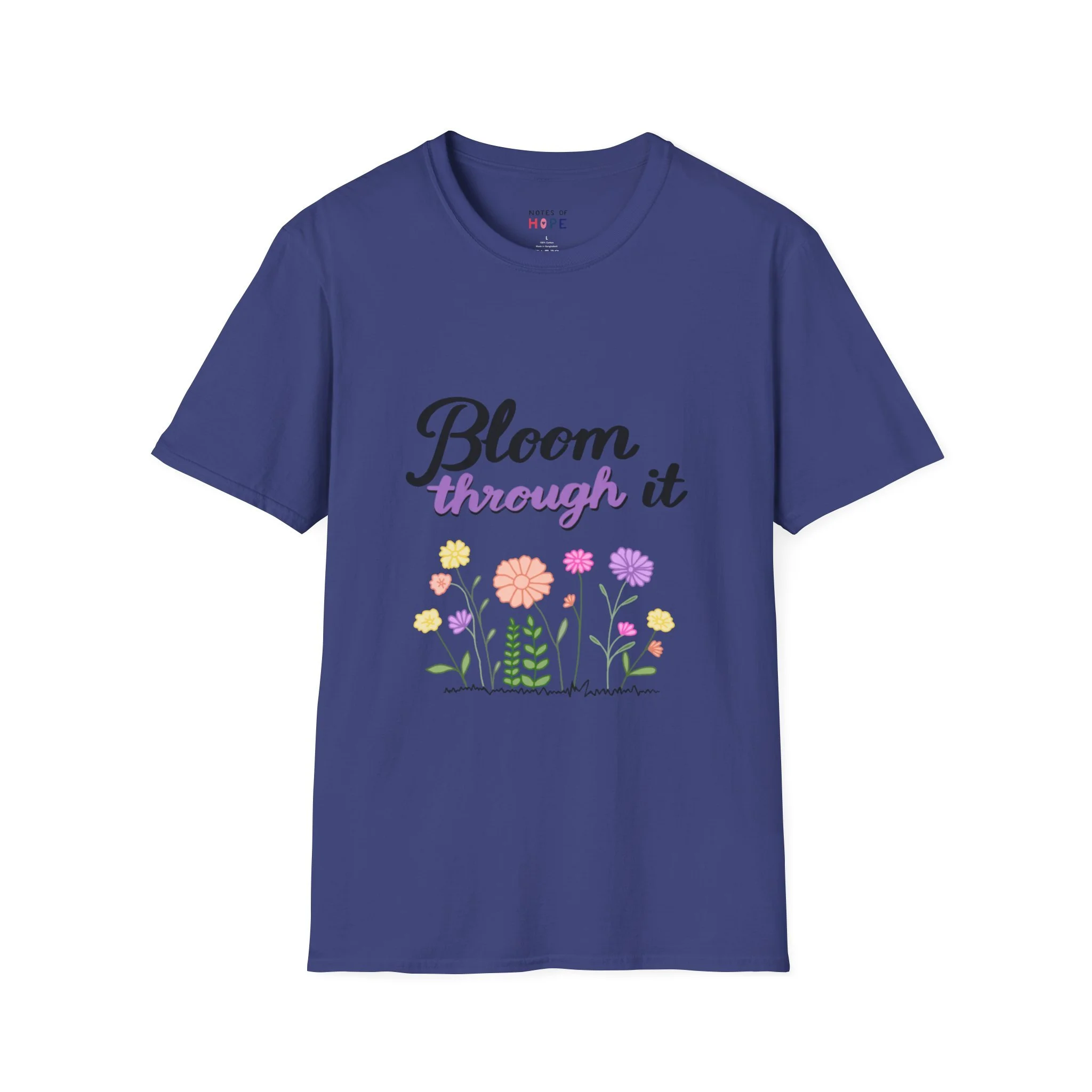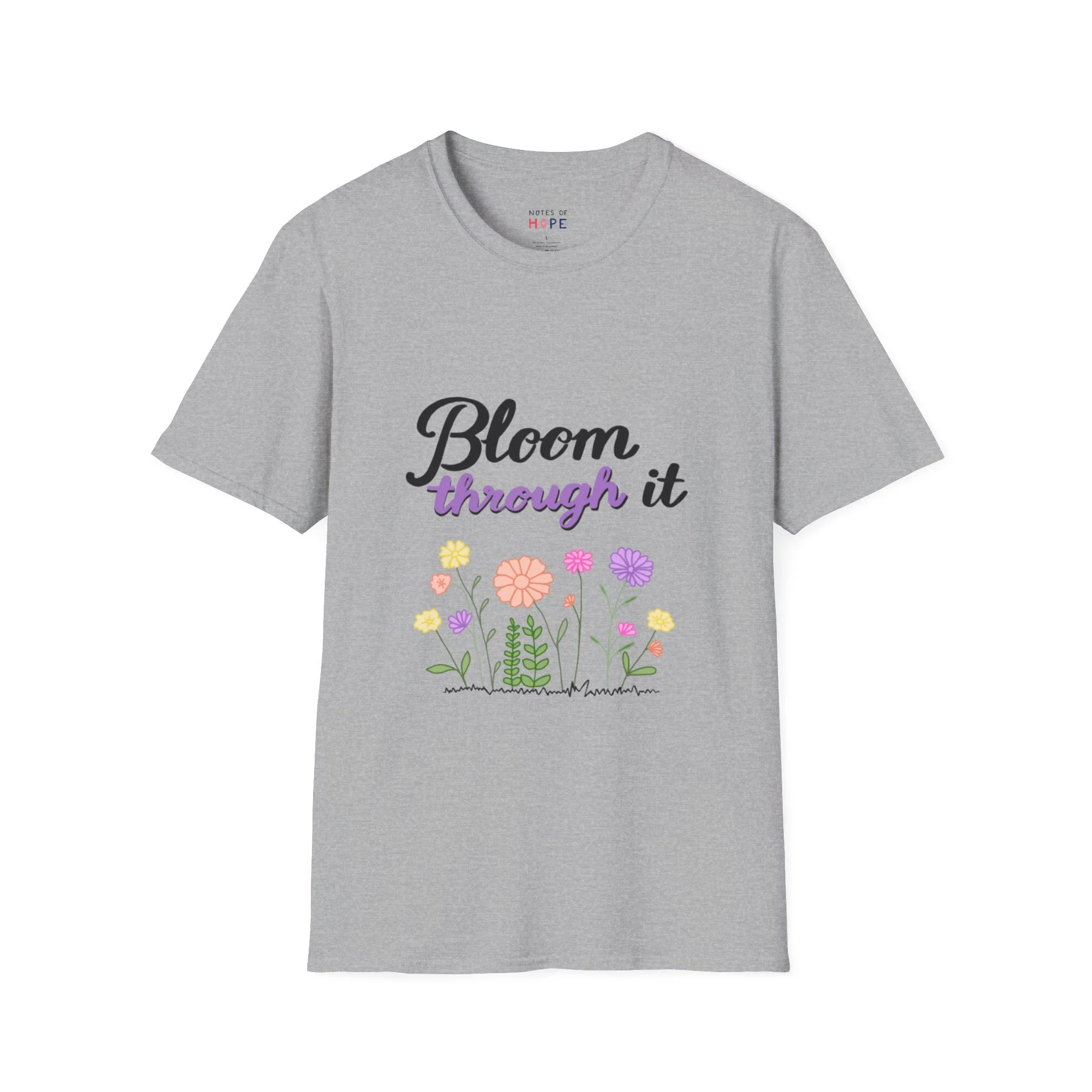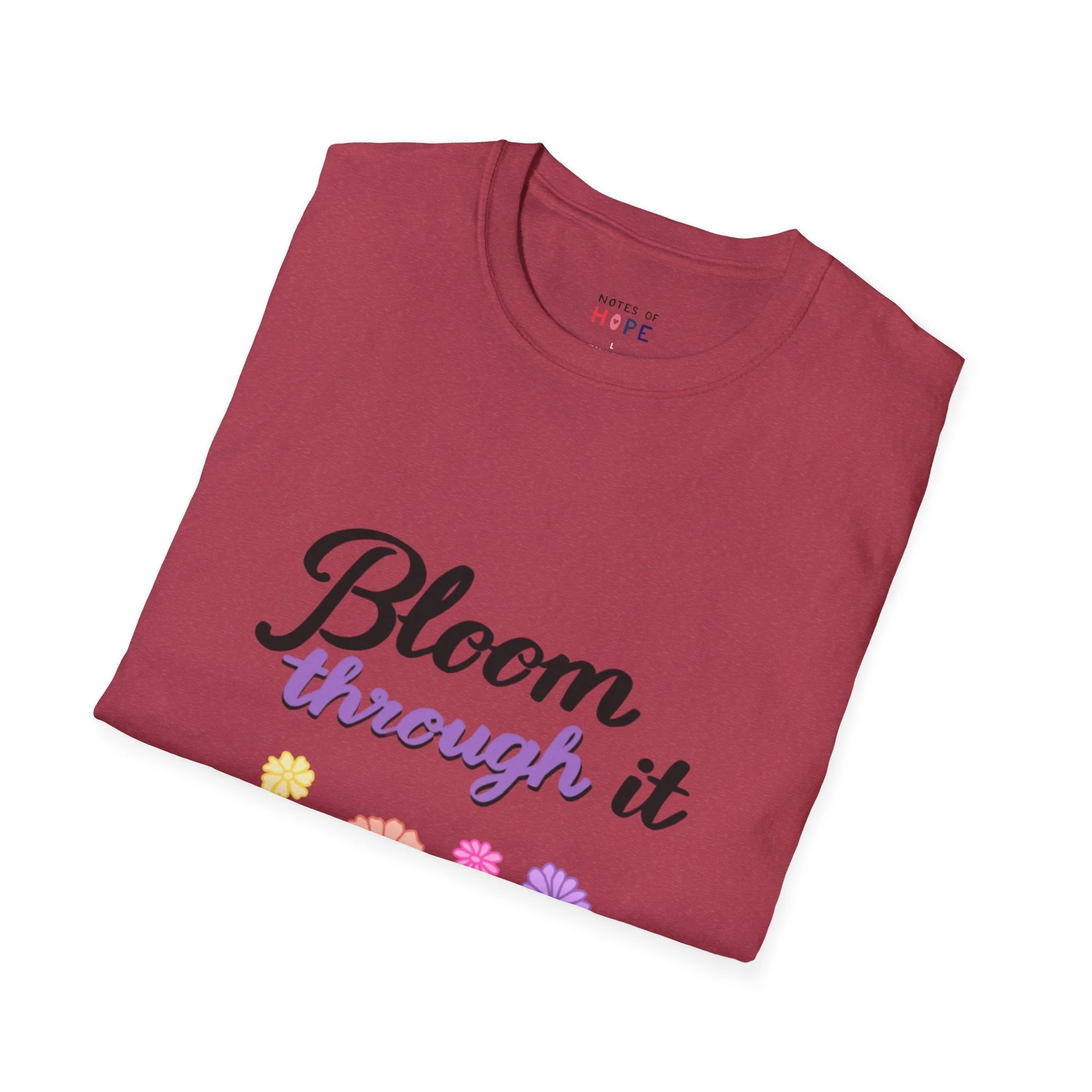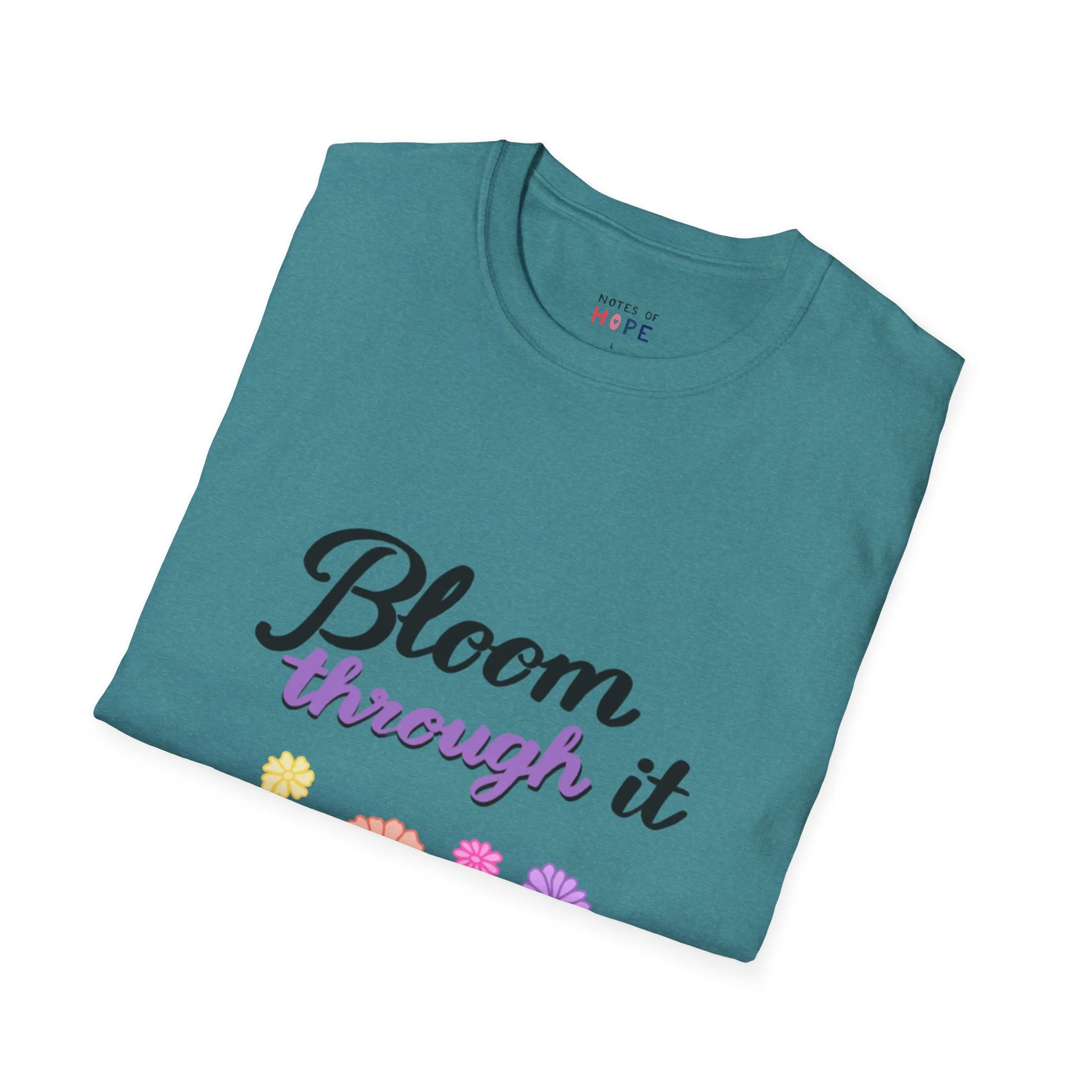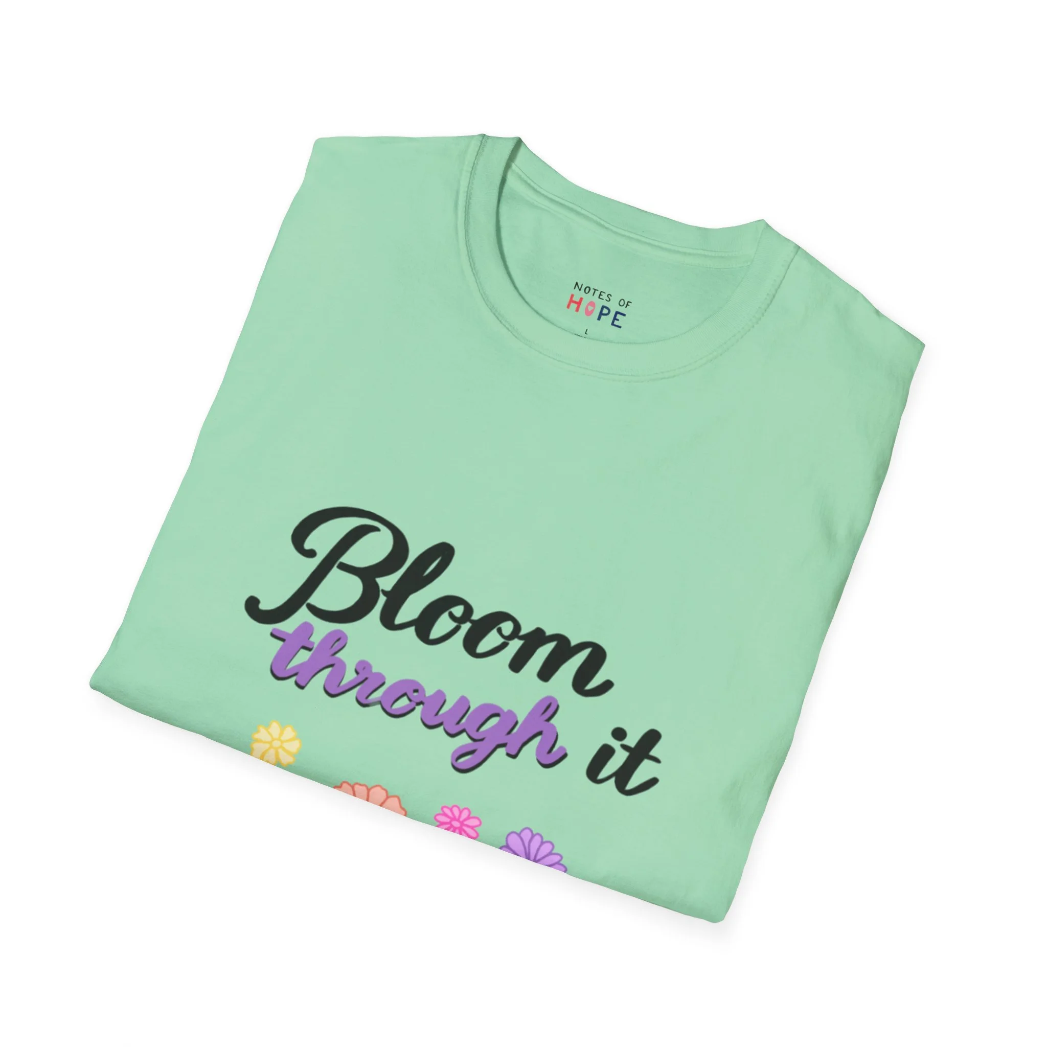 Soft, gentle, and quietly hopeful — this lightweight tee carries a small garden of hand-drawn flowers and the tender reminder: “Bloom through it.” The crew neck and classic fit sit comfortably at the shoulders while the smooth ring-spun cotton feels breathable against the skin. Wear it on slow mornings, neighborhood walks, or layered under a cardigan when you need something calm and reassuring. The delicate floral palette and cursive script read like a note from a friend — subtle, uplifting, and steady.