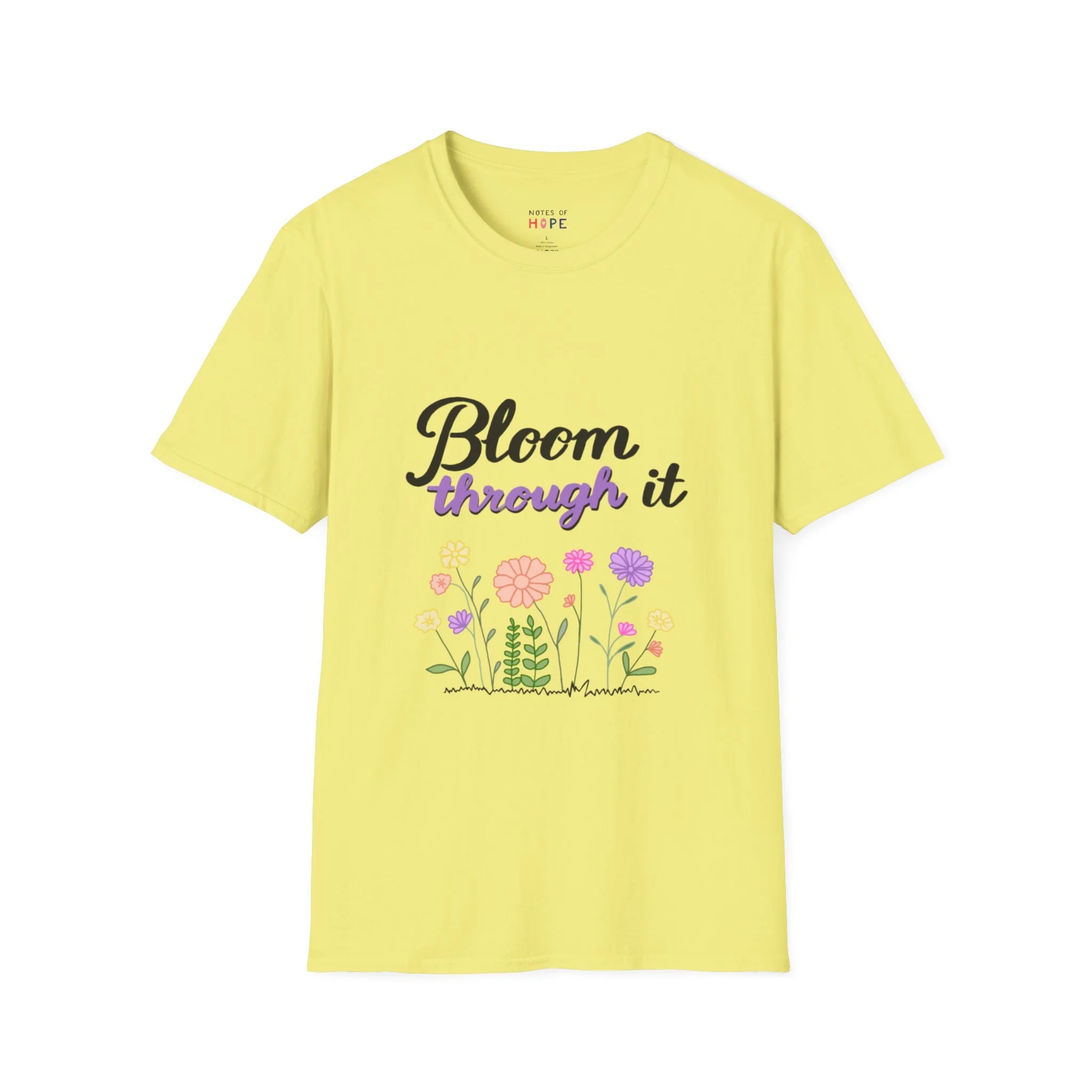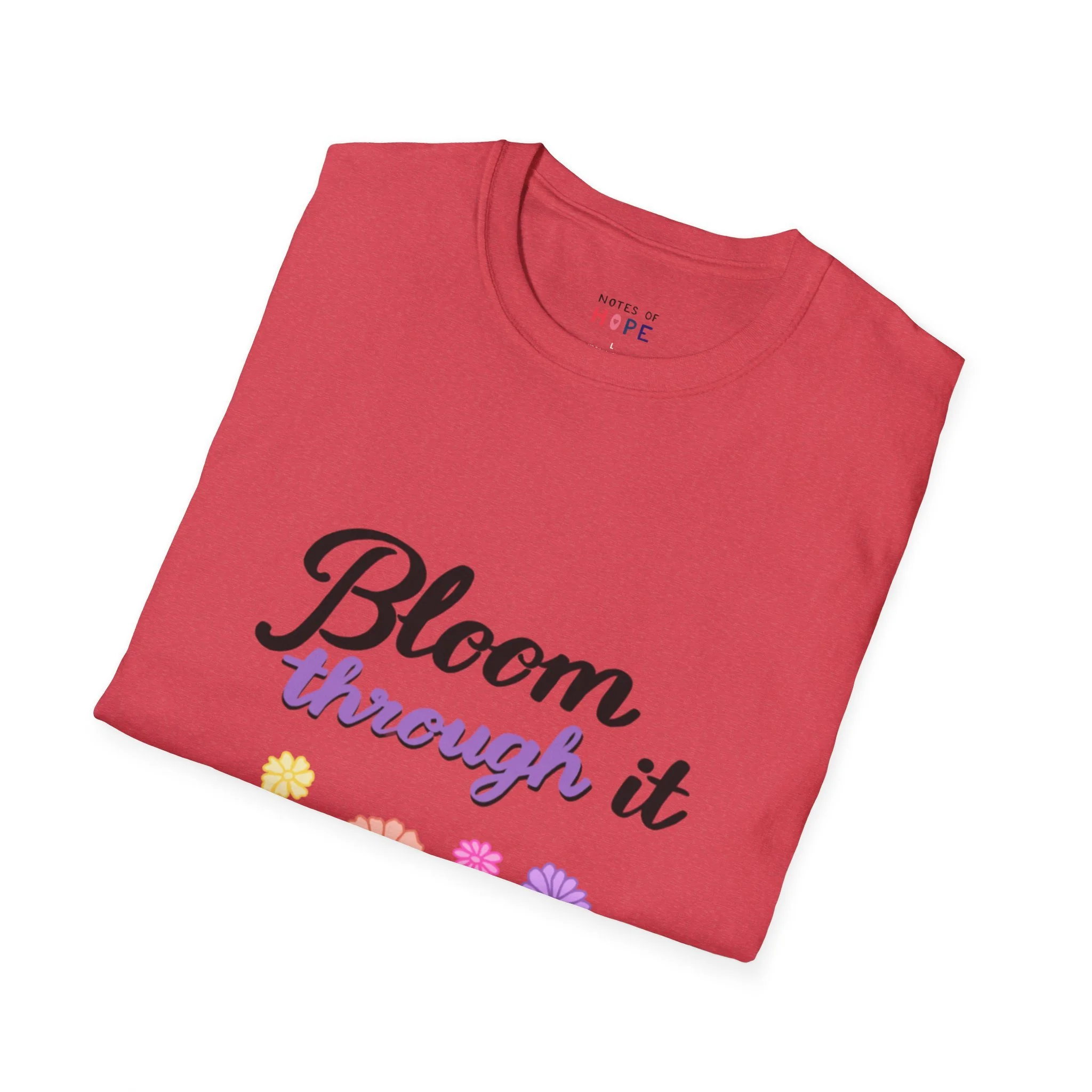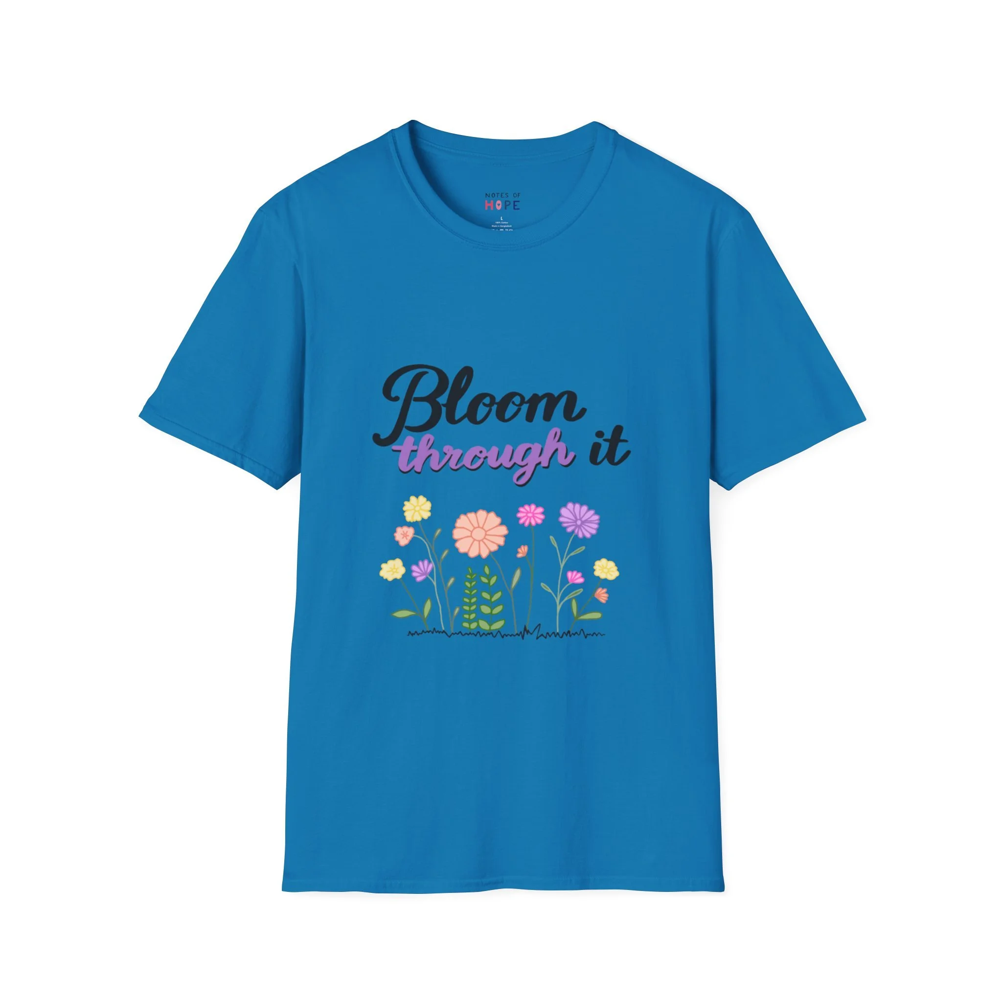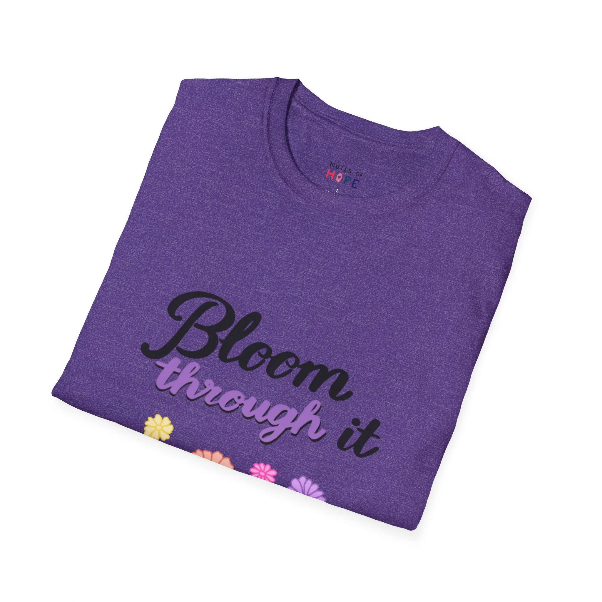 Soft, gentle, and quietly hopeful — this lightweight tee carries a small garden of hand-drawn flowers and the tender reminder: “Bloom through it.” The crew neck and classic fit sit comfortably at the shoulders while the smooth ring-spun cotton feels breathable against the skin. Wear it on slow mornings, neighborhood walks, or layered under a cardigan when you need something calm and reassuring. The delicate floral palette and cursive script read like a note from a friend — subtle, uplifting, and steady.