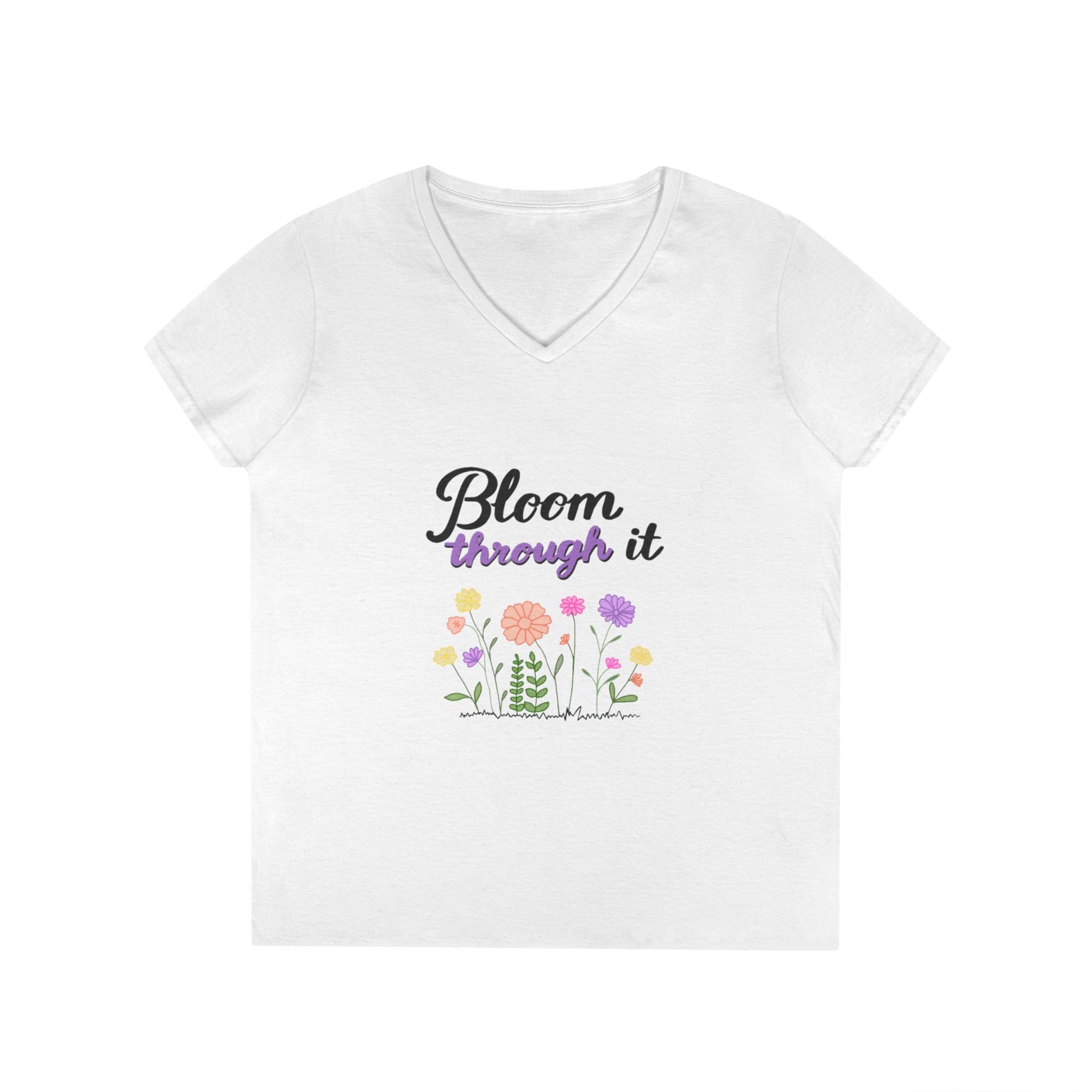 Soft and simple, this V-neck tee reads like a little pep talk you can wear. A gentle floral line-up sits beneath the hand-lettered message “Bloom through it,” blending pastel blooms and soft greens for a hopeful, everyday look. The semi-fitted cut and medium-weight cotton make it comfortable for layering or wearing on its own during casual days spent with friends, walking neighborhood gardens, or pausing for a quiet moment. It feels like a warm, encouraging nudge—subtle, feminine, and easy to style with jeans, a cardigan, or your favorite spring skirt.