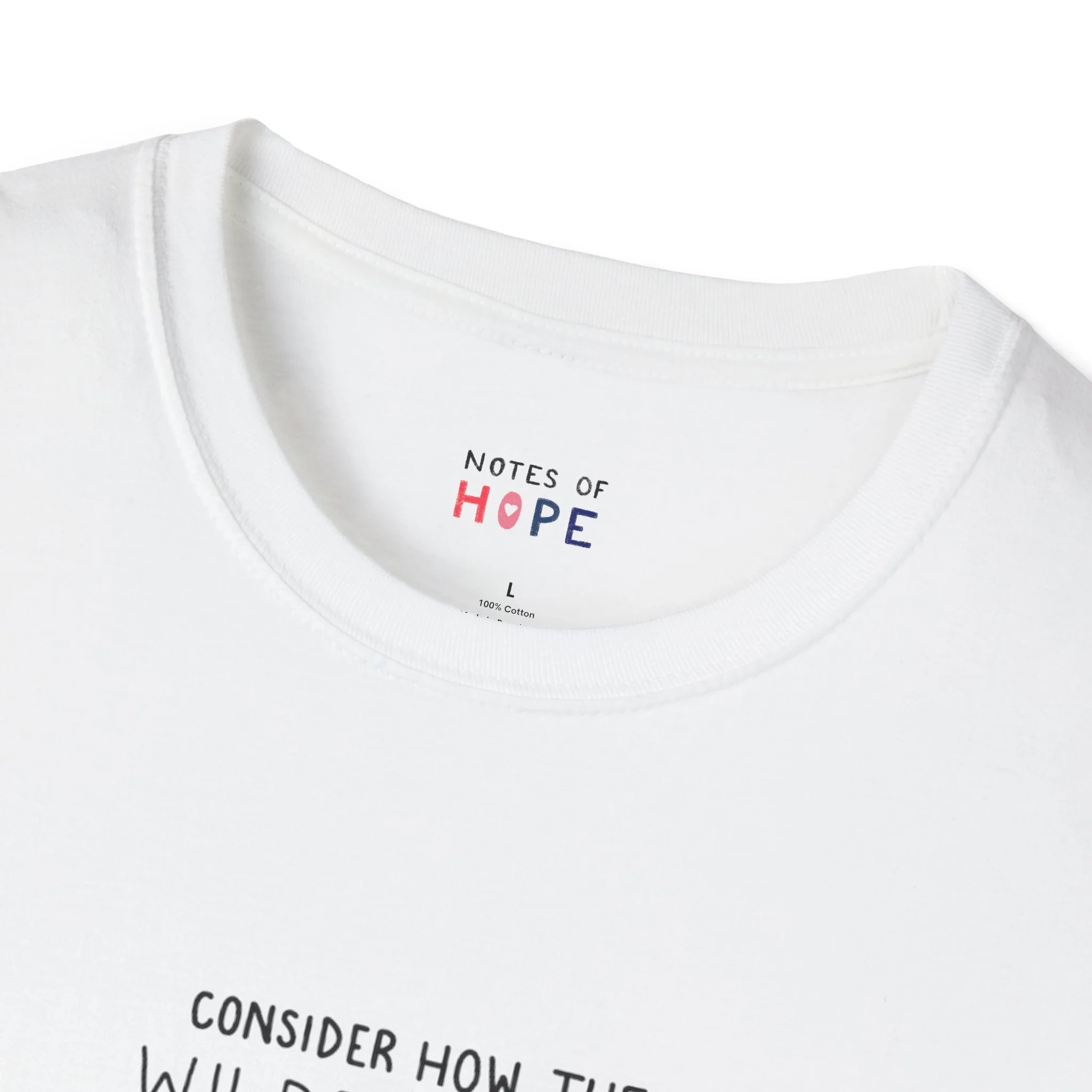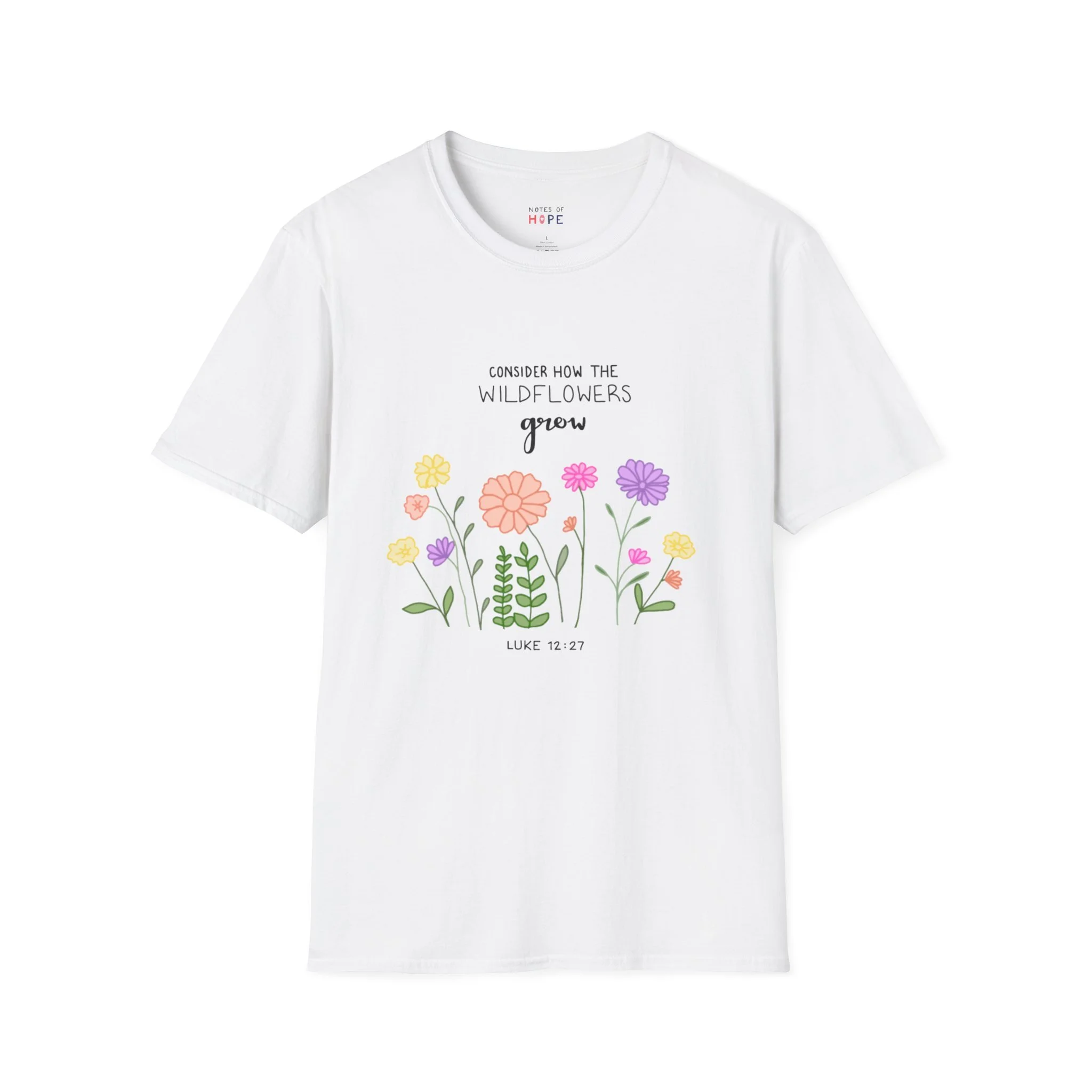 Lightweight, breathable cotton with a gentle hand and a hand-drawn wildflower print that feels like a quiet morning in a meadow. Soft crew neckline and a classic fit sit comfortably for all-day wear. The delicate illustration — pastel blossoms, leafy stems, and the phrase “Consider how the wildflowers grow” — reads like a small reminder to slow down and notice the little things. Wear it over denim for a weekend walk, layered under a cardigan for cooler evenings, or tucked into a skirt for a casual gathering. The understated design pairs with vintage and cottage-core wardrobes, bringing a touch of calm and optimism to everyday outfits.